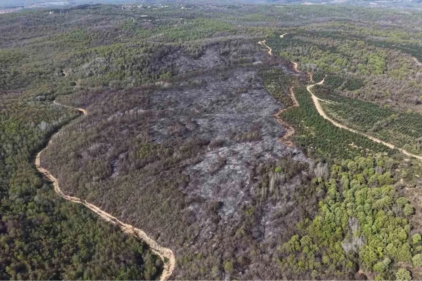 Beykoz’daki orman yangınının bilançosu günün ilk ışıklarıyla netleşti. Ekiplerin yaklaşık 9 saat süren yoğun müdahalesiyle gece saatlerinde kontrol altına alınan yangında küle dönen ormanlık alan havadan görüntülendi. Beykoz Kılıçlı Mahallesi’nde dün öğle saatlerinde başlayan ve rüzgarın etkisiyle geniş bir alana yayılan yangın, ekiplerin yaklaşık 9 saat süren yoğun müdahalesiyle gece saatlerinde kontrol altına alındı. Gece boyunca süren söndürme ve soğutma çalışmalarının ardından, sabah saatlerinde yangının verdiği zarar da ortaya çıktı. Yapılan tespitlere göre, yangında yaklaşık 14 hektarlık ağaçlandırma sahası ile makilik alanın zarar gördüğü bildirildi. Yangına Orman Bölge Müdürlüğü, itfaiye ve AFAD ekipleri müdahale ederken; 3 helikopter, 51 araç ve 146 personel görev aldı. Öte yandan, yangının ilk etapta kontrol altına alınmasına rağmen rüzgarın etkisiyle yeniden alevlendiği; ekiplerin gece boyunca aralıksız çalışarak yangını tekrar kontrol altına aldığı öğrenildi. Bölgede soğutma çalışmalarının sürdüğü ve yangının çıkış nedenine ilişkin incelemelerin devam ettiği bildirildi.