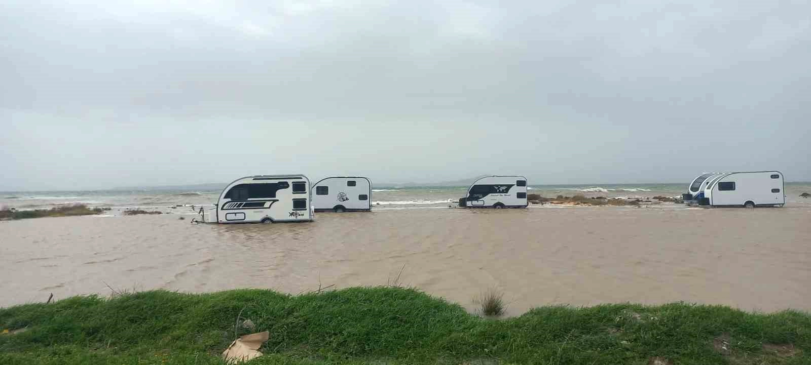 Çanakkale’de etkili olan fırtına nedeniyle Ezine ilçesinde deniz kara ile birleşirken, bölgede bulunan karavanlar su altında kaldı.