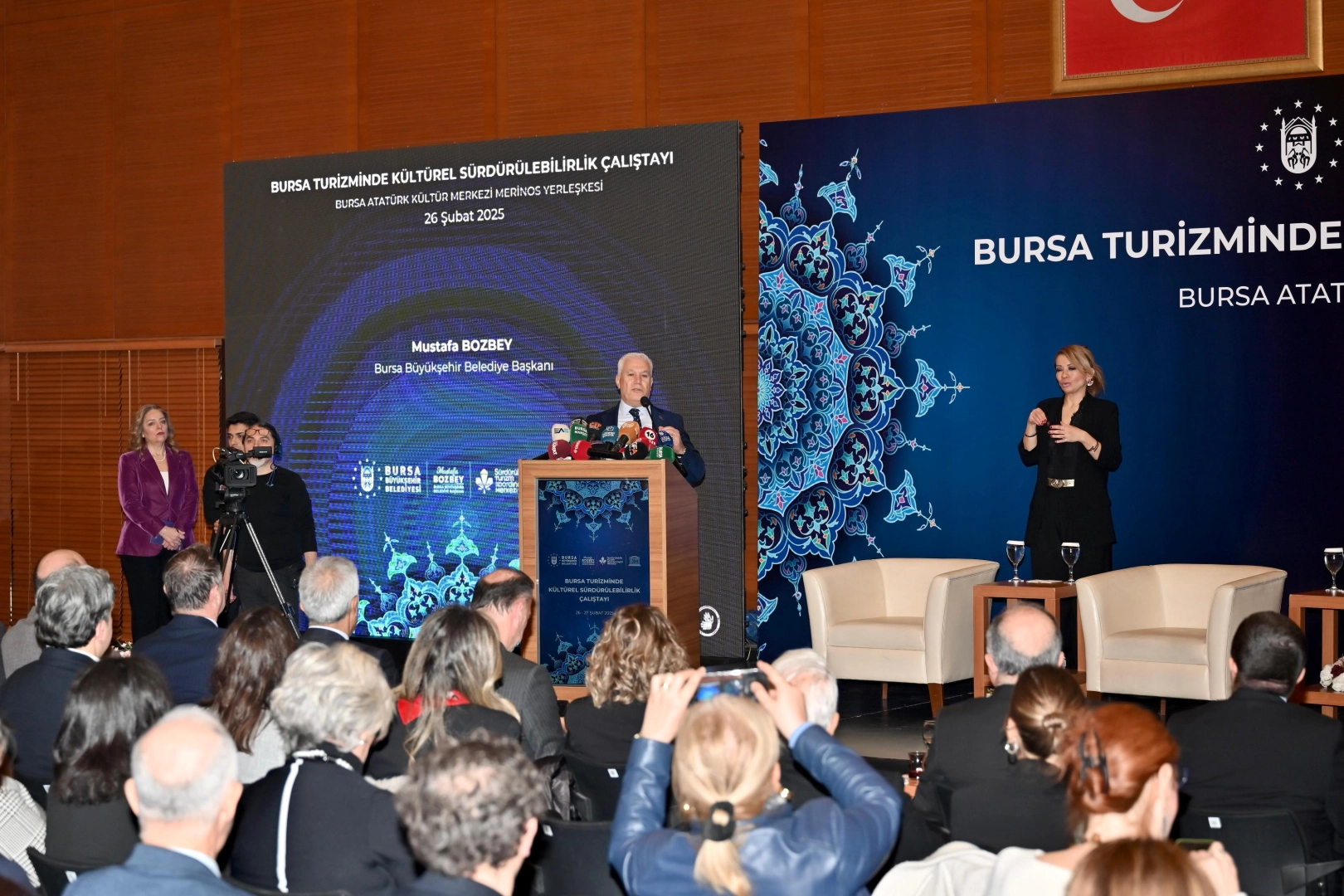 Bursa Büyükşehir Belediye Başkanı Mustafa Bozbey, birkaç yıl içerisinde Bursa’da geceleme sayısını önce 2’ye sonra 3’e çıkarmayı hedeflediklerini anlatarak, “İşte o zaman turizmin gelirlerinden faydalanabiliriz. Bursa’yı 4 mevsim, 12 ay cıvıl cıvıl yaşatmak, festivallerimizi daha iyi ve sürdürülebilir yapmak hepimizin sorumluluğudur” dedi. Bursa Büyükşehir Belediyesi, kentin kültürel değerlerini korumak, geleceğe taşımak ve turizm potansiyelini güçlendirmek amacıyla 'Bursa Turizminde Kültürel Sürdürülebilirlik Çalıştayı' düzenliyor. Sürdürülebilir Turizm Koordinasyon Merkezi’nin çalışmaları kapsamında Merinos Atatürk Kongre Kültür Merkezi’nde gerçekleştirilen çalıştayda, iki gün boyunca 77 konuşmacının katılımıyla 16 oturum yapılacak. Turizm sektörünün uzman isimleri ve paydaşları, bir kültür turizmi destinasyonu olan Bursa’nın kültürel sürdürülebilirliğini tartışacak. Çalıştayın açılış programına Bursa Büyükşehir Belediye Başkanı Mustafa Bozbey’in yanı sıra Türkiye Turizm Tanıtım ve Geliştirme Ajansı Genel Müdür Yardımcısı Dr. Elif Balcı Füsunoğlu, İl Kültür ve Turizm Müdürü Dr. Kamil Özer, Mudanya Üniversitesi Rektörü Prof. Dr. Emin Karip, TÜRSAB Güney Marmara BTK Başkanı Murat Saraçoğlu, Büyükşehir Belediyesi genel sekreter yardımcıları ve daire başkanları, akademisyenler, turizm sektörünün temsilcileri ve sivil toplum kuruluşlarının yöneticileri katıldı.