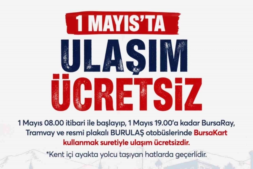 Bursa Büyükşehir Belediyesi, emeğin ve emekçinin yanında olmaya devam ediyor. 1 Mayıs Emek ve Dayanışma Günü’nde kutlama ve etkinliklerin coşkulu kalabalıklarla yapılabilmesi amacıyla BursaRay ve tramvay hatları ile resmi plakalı Burulaş otobüsleri, 1 Mayıs 2026 Cuma günü 08.00 ile 19.00 saatleri arasında BursaKart kullanmak suretiyle ücretsiz olarak hizmet verecek. Uygulama, kent içi yolcu taşıyan hatlarda geçerli olacak.