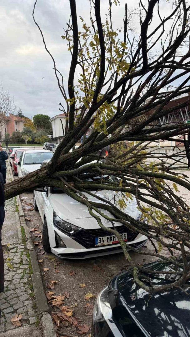 Bursa’da araçların üzerine devrilen ağaç korku dolu anlar yaşatırken, sadece maddi hasarın meydana gelmesi sevindirdi.