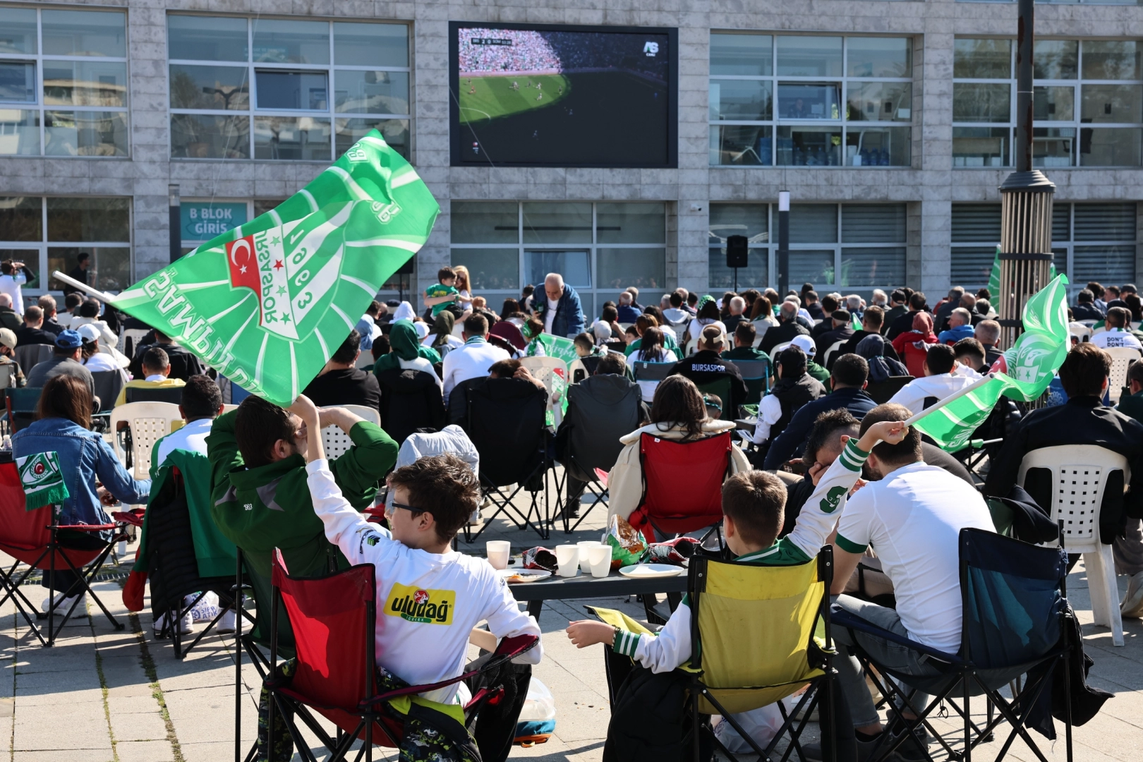 TFF Nesine 2. Lig’de şampiyonluk düğümünün çözüldüğü müsabaka, Nilüfer Belediyesi’nin organizasyonuyla Halk Evi önündeki Cumhuriyet Meydanı’na taşındı. “Omuz Omuza Zafer Yolu” sloganıyla düzenlenen etkinlikte 7’den 70’e yüzlerce yeşil beyazlı takımın sevdalısı tarihi ana tanıklık etti. Somaspor ile oynanan karşılaşmaya yoğun ilgi gösteren Bursasporlu taraftarlar, meydanı adeta bir stadyum atmosferine çevirdi. Maç boyunca heyecanın düşmediği alanda, atılan her gol sonrası coşku tavan yaptı. Bitiş düdüğünün ardından bayram yerine dönen meydanda, bayraklar, marşlar ve tezahüratlar eşliğinde şampiyonluk sevinci yaşandı.