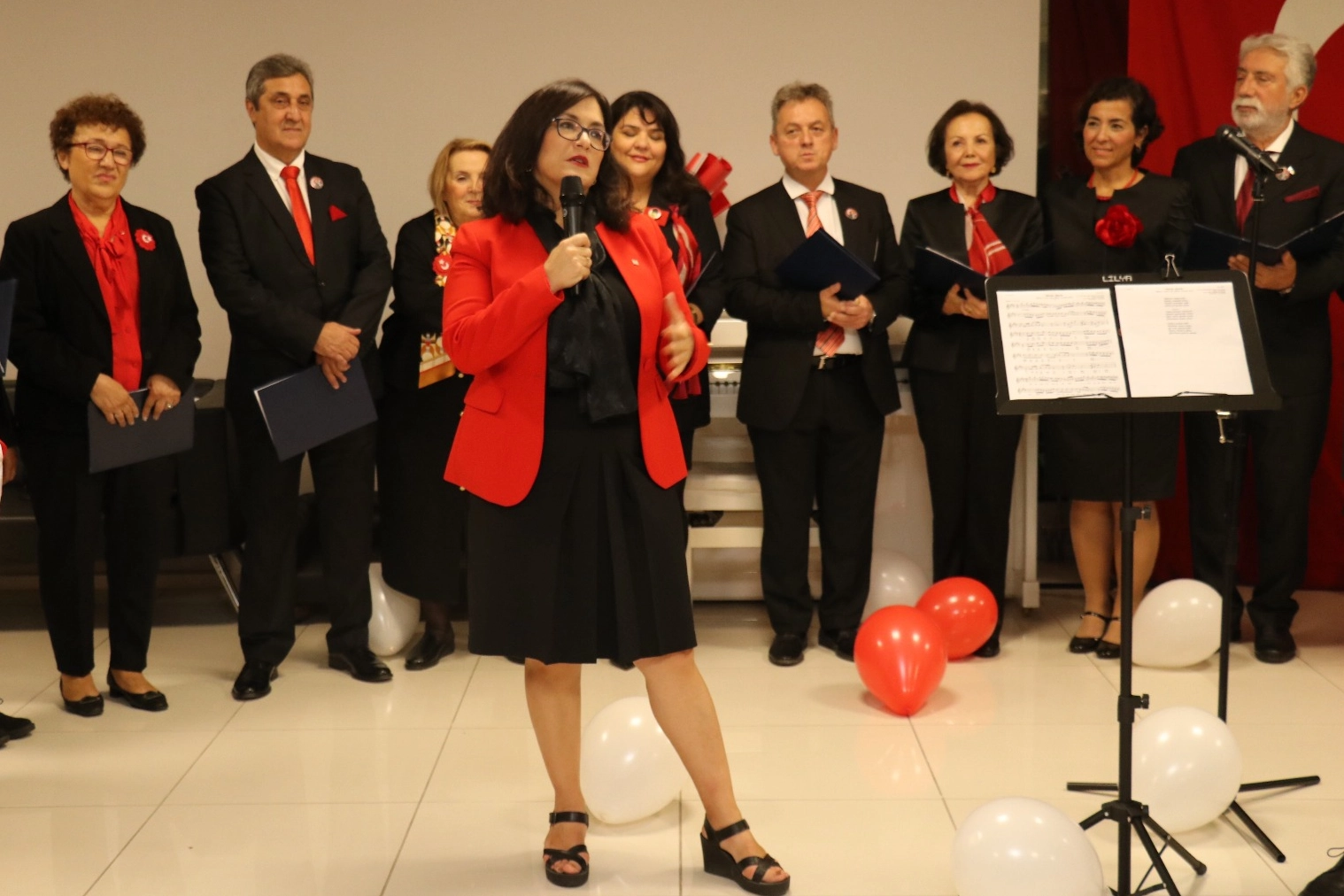 Açılış konuşmanın ardından başlayan etkinlikte, oda üyelerinden oluşan Türk Sanat Müziği korosu sahne aldı. Atatürk’ün sevdiği şarkıların seslendirildiği bölümde davetliler ellerinde Türk bayraklarıyla koroya eşlik etti.