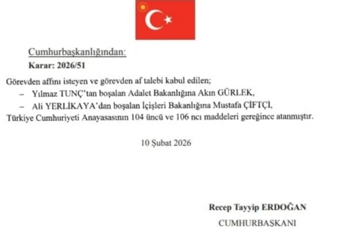 Resmi Gazetede yayınlanan atama kararlarına göre İçişleri Bakanı Ali Yerlikaya ile Adalet Bakanı Yılmaz Tunç görevden alındı ve İçişleri Bakanı olarak Erzurum Valisi Mustafa Çiftçi, Adalet Bakanı olarak İstanbul Cumhuriyet Başsavcısı Akın Gürlek atandı.