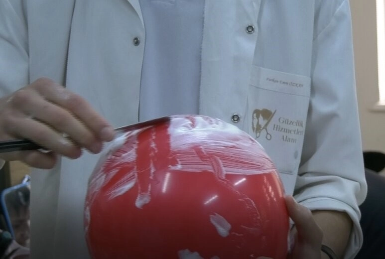 Gerçek müşteriyi tıraş edebilmek için Osmanlı döneminde kullanılan yöntem deneniyor.Şişirilen balona köpük sürülüyor. Öğrenciler jilet kullanarak köpüklü balonu patlatmazlarsa başarılı oluyorlar.