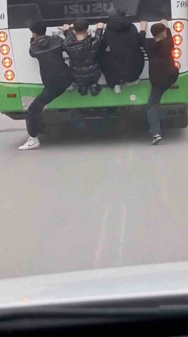 Edinilen bilgiye göre, Millet Mahallesi’nde özel halk otobüsünün arkasına asılan öğrenciler, trafikte ilerleyen otobüsün arasında yolculuk yaptı. Otobüs şoförünün durumdan haberdar olmadığı öğrenilirken, öğrencilerin bu davranışı gören vatandaşlar büyük panik yaşadı.