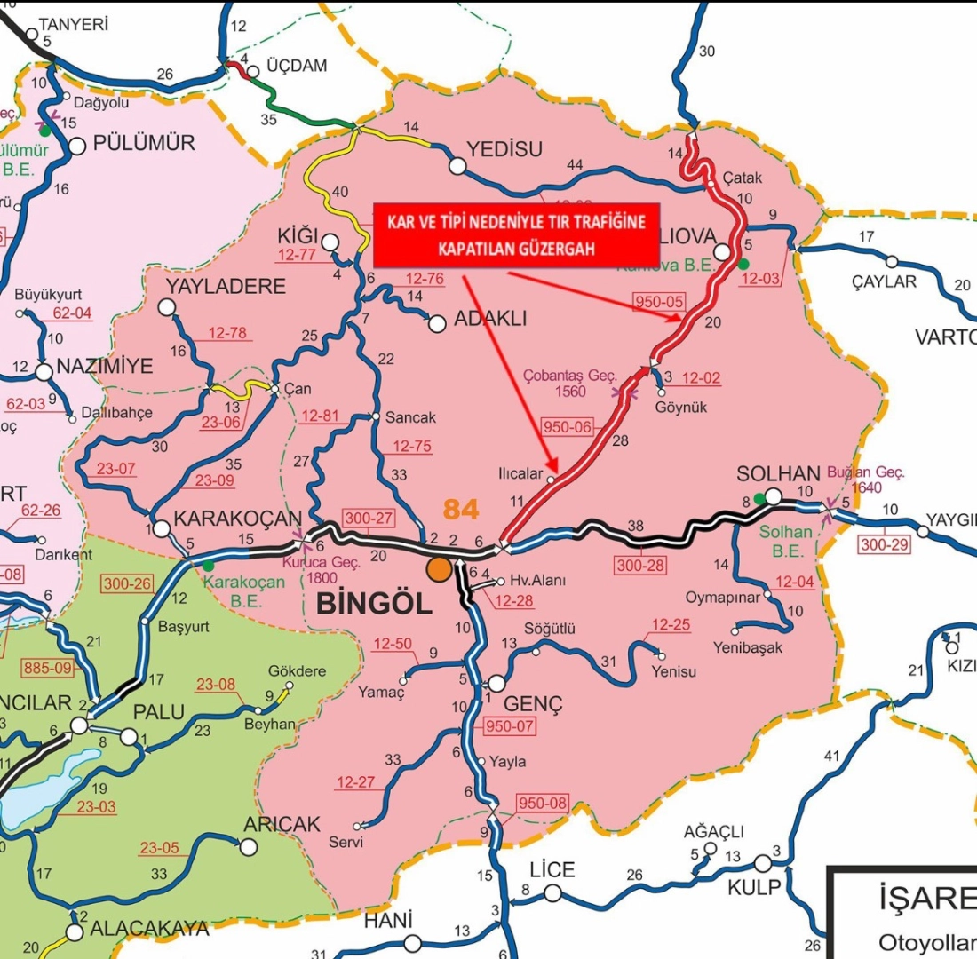 Bingöl Valiliği’nden yapılan açıklamada, "Bingöl-Erzurum Devlet Yolunun 0-88 km’leri arası ( Karvansaray kavşağı ile Bingöl-Erzurum İl sınırı arası) yoğun kar yağışı ve tipi nedeniyle saat 16:55 itibarıyla TIR trafiğine kapatılmıştır" denildi.
