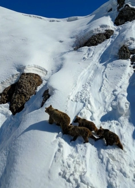 Bingöl’de kış uykusundan uyanarak karla kaplı arazide dolaşan ayı ve üç yavrusu dron ile görüntülendi.