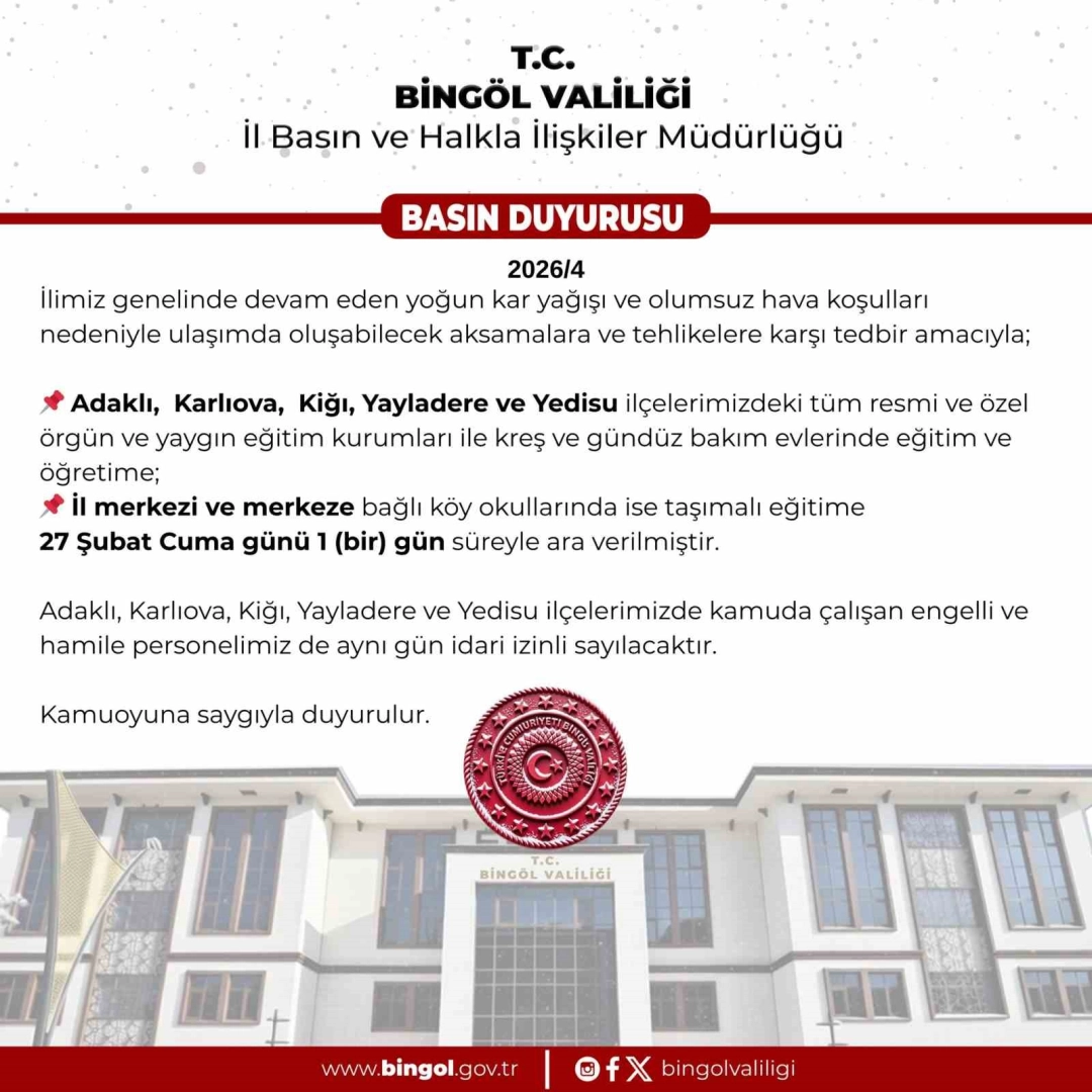 Bingöl Valiliğinin yaptığı açıklamada, "İlimiz genelinde devam eden yoğun kar yağışı ve olumsuz hava şartları nedeniyle ulaşımda oluşabilecek aksamalara ve tehlikelere karşı tedbir amacıyla; Adaklı, Karlıova, Kiğı, Yayladere ve Yedisu ilçelerimizdeki tüm resmi ve özel örgün ve yaygın eğitim kurumları ile kreş ve gündüz bakım evlerinde eğitim ve öğretime; il merkezi ve merkeze bağlı köy okullarında ise taşımalı eğitime 27 Şubat Cuma günü 1 gün süreyle ara verilmiştir. Adaklı, Karlıova, Kiğı, Yayladere ve Yedisu ilçelerimizde kamuda çalışan engelli ve hamile personelimiz de aynı gün idari izinli sayılacaktır" denildi.