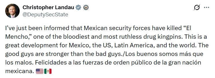 ABD Dışişleri Bakanı Yardımcısı Christopher Landau, Meksika’daki Jalisco Yeni Nesil Karteli (CJNG) lideri "El Mencho" lakaplı Nemesio Oseguera’nın düzenlenen askeri operasyon sırasında öldürülmesi hakkında, "Bu Meksika, ABD, Latin Amerika ve dünya için harika bir gelişme" açıklamasında bulundu.