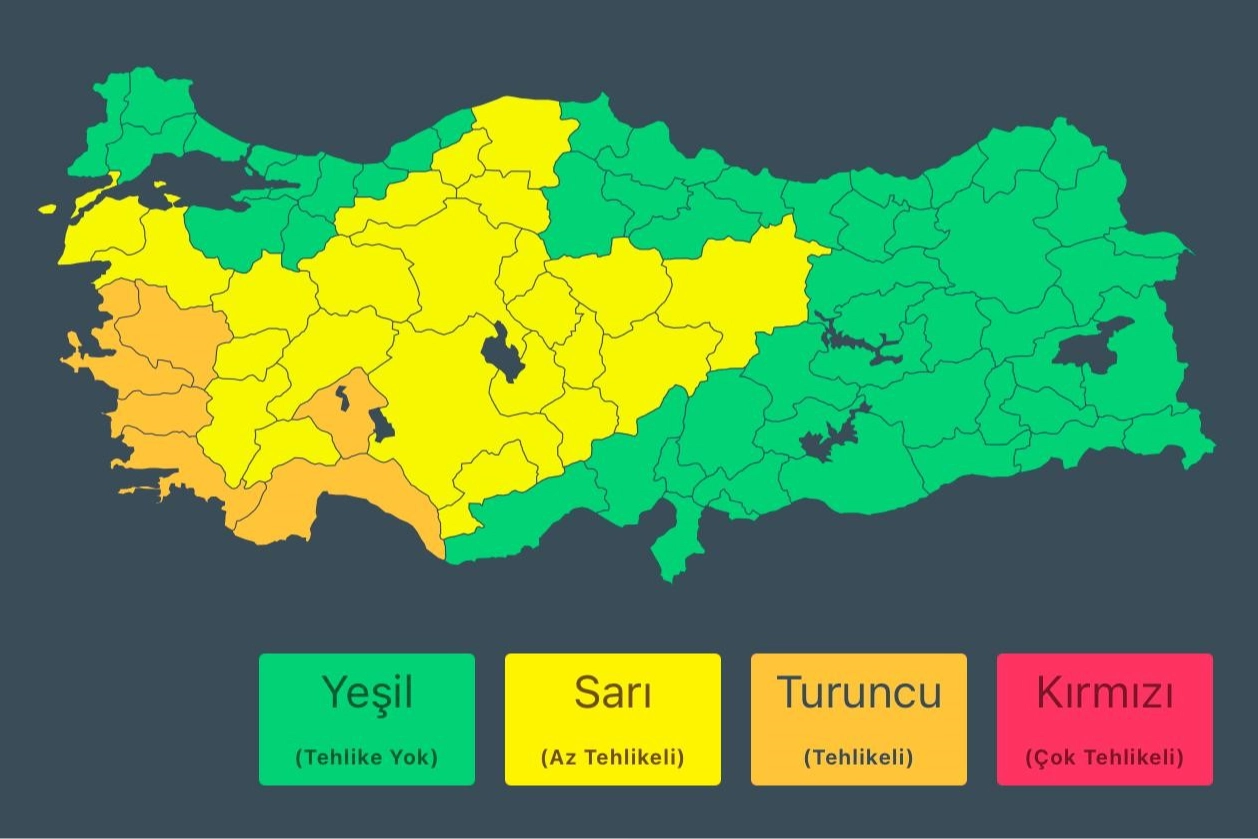AFAD’ın sosyal medya hesabından yapılan paylaşımda, Meteoroloji Genel Müdürlüğü’nden alınan son bilgilere ve yapılan değerlendirmelere yer verilerek, "24 Aralık Salı günü, sabah saatlerinden itibaren batı ve merkez ilçelerinde, öğle saatlerinden itibaren doğu ilçelerinde genellikle çok kuvvetli ve şiddetli; Kaş, Demre, Finike, Aksu, Serik, İbradı, Manavgat ve Alanya ilçelerinde şiddetli yer yer aşırı; Muğla’da şiddetli ve yer yer aşırı; İzmir, Manisa, Denizli, Uşak ve Kütahya çevrelerinde kuvvetli; Aydın çevreleri, İzmir’in iç kesimleri ile Manisa’nın güney kesimlerinde yer yer çok kuvvetli; Isparta çevreleri, Burdur’un doğusu ve Konya’nın güneybatısında çok kuvvetli ve yer yer şiddetli; sağanak ve gök gürültülü sağanak yağış bekleniyor. Akdeniz ve İç Anadolu ile Batı Karadeniz’in iç kesimlerinde güney yönlerden kuvvetli ve fırtına; yüksek kesimlerinde yer yer hamleli kuvvetli fırtına şeklinde rüzgar bekleniyor" ifadelerine yer verildi.