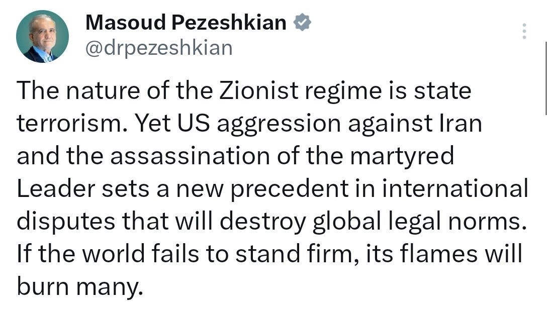 İran Cumhurbaşkanı Mesud Pezeşkiyan, sosyal medya hesabından ABD ve İsrail’in ülkesine yönelik saldırıları ile ilgili açıklamalarda bulundu. Devlet terörizminin İsrail’deki siyonist rejimin doğası olduğunu vurgulayan Pezeşkiyan, "Ancak, ABD’nin İran’a karşı saldırganlığı ve şehit liderimize yönelik suikast uluslararası hukuk normlarını yıkan yeni bir emsal teşkil etmektedir. Eğer dünya bu duruma kararlı şekilde karşı çıkmazsa, alevleri birçoğunu yakacaktır" ifadelerini kullandı.