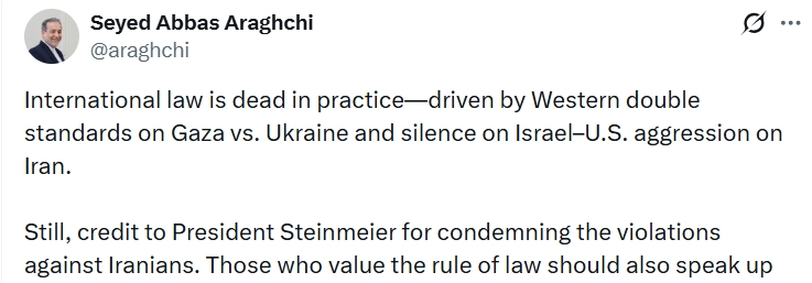 İran Dışişleri Bakanı Abbas Arakçi, sosyal medya hesabından yaptığı paylaşımda ABD ve İsrail’in ülkesine yönelik saldırıları ve Batı dünyasının bu konudaki tutumuna tepki gösterdi. Arakçi, "Uluslararası hukuk pratikte ölmüştür. Bunun nedeni, Batı’nın Gazze ve Ukrayna konusunda uyguladığı çifte standartlar ve İsrail ile ABD’nin İran’a yönelik saldırganlığı konusundaki sessizliğidir" ifadelerini kullandı. Almanya Cumhurbaşkanı Frank-Walter Steinmeier’in ABD ve İsrail’in İran’a yönelik saldırılarını ve Almanya hükümetinin bu konudaki tutumunu eleştiren sözlerini hatırlatan Arakçi, "Yine de, İranlılara yönelik ihlalleri kınadığı için Cumhurbaşkanı Steinmeier’i takdir etmek gerekir. Hukukun üstünlüğüne değer veren herkes sesini yükseltmelidir" dedi.
