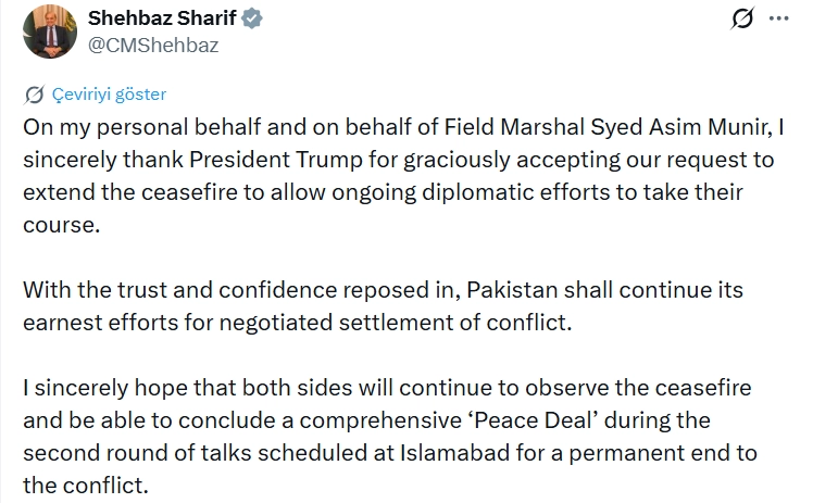 Pakistan Başbakanı Şahbaz Şerif, diplomatik çabaların devamına imkan tanımak için İran’la varılan 2 haftalık ateşkesi uzatma taleplerini kabul eden ABD Başkanı Donald Trump’a teşekkür etti.