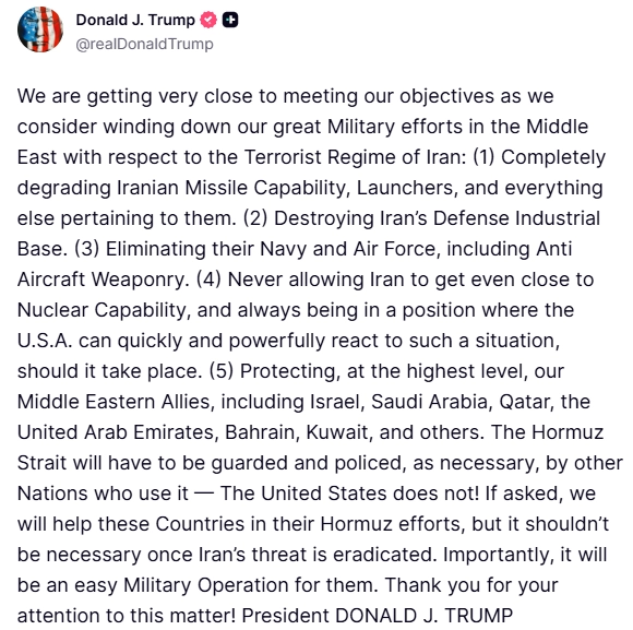 ABD Başkanı Donald Trump, İran’a karşı başlatılan savaşla ilgili sosyal medya hesabından açıklamalarda bulundu. İran’a yönelik askeri operasyonun kademeli olarak sona erebileceğini belirten Trump, "İran’daki rejime karşı Ortadoğu’da sürdürdüğümüz büyük askeri çabalarımızı azaltmayı düşünürken, hedeflerimize çok yaklaştık" ifadelerini kullandı. İran ile ilgili bu hedeflerine açıklık getiren Trump, "İran’ın füze kabiliyetini, fırlatma rampalarını ve bunlarla ilgili her şeyi tamamen etkisiz hale getirmek. İran’ın savunma sanayisini imha etmek. Uçaksavar silahları da dahil olmak üzere İran’ın donanmasını ve hava kuvvetlerini ortadan kaldırmak. İran’ın nükleer silah üretme kapasitesine yaklaşmasına asla izin vermemek ve böyle bir durumun gerçekleşmesi halinde ABD’nin hızlı ve güçlü bir şekilde tepki verebileceği bir konumda olmak. İsrail, Suudi Arabistan, Katar, Birleşik Arap Emirlikleri, Bahreyn, Kuveyt ve diğerleri de dahil olmak üzere Orta Doğu’daki müttefiklerimizi en üst düzeyde korumak" ifadelerini kullandı.