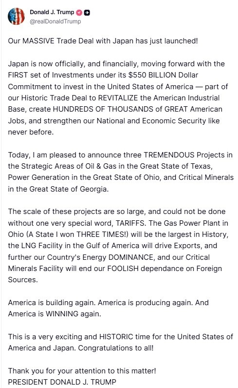 ABD Başkanı Donald Trump, sosyal medya hesabından yayınladığı mesajda Japonya ile varılan ticaret anlaşması hakkında açıklamalarda bulundu. Temmuz ayında varılan "devasa" ticaret anlaşmasının resmen hayata geçtiğini belirten Trump, "Japonya, ABD’ye 550 milyar dolarlık yatırım taahhüdünün ilk aşamasını resmen mali olarak hayata geçiriyor. Bu yatırımlar, Amerikan sanayisini canlandırmak, yüz binlerce Amerikalıya istihdam sağlamak ve ulusal ve ekonomik güvenliğimizi daha önce hiç olmadığı kadar güçlendirmek için imzaladığımız tarihi ticaret anlaşmamızın bir parçasıdır" değerlendirmesinde bulundu.