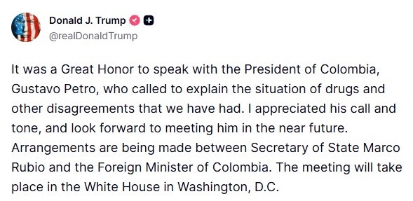 ABD Başkanı Donald Trump, Kolombiya Devlet Başkanı Gustavo Petro ile telefon görüşmesi gerçekleştirdiğini duyurarak, "Beni aramasını ve üslubunu takdir ettim