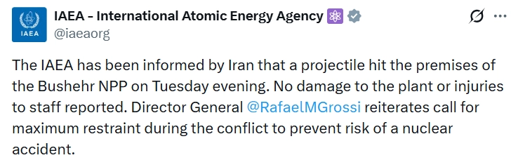 Uluslararası Atom Enerjisi Ajansı, İran yönetiminin Buşehr Nükleer Santrali yerleşkesine salı akşamı füze isabet ettiğini bildirdiğini duyurarak, santralde hasar meydana gelmediğini açıkladı.