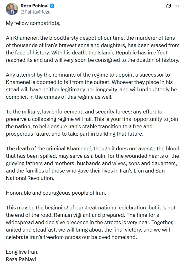 Devrik İran Şahı Muhammed Rıza Pehlevi’nin sürgündeki oğlu Rıza Pehlevi, İran’ın Dini lideri Ayetullah Ali Hamaney’in hayatını kaybetmesi üzerine yazılı bir açıklama yayınladı. Hamaney’i "kana susamış bir despot" olarak niteleyen Pehlevi, "İran’ın en cesur evlatlarından on binlercesinin katili olan Hamaney, tarih sahnesinden silinmiştir. Onun ölümüyle birlikte İran İslam Cumhuriyeti fiilen sona ermiştir ve çok yakında tarihin çöplüğüne karışacaktır" ifadelerini kullandı. Hamaney’in yerine birini getirmenin imkansız olduğunu öne süren Pehlevi, "Rejim kalıntılarının Hamaney’e bir halef atamaya yönelik her türlü girişimi daha en başından başarısız olmaya mahkumdur. Onun yerine kimi getirirlerse getirsinler, ne meşruiyeti ne de kalıcılığı olacaktır ve hiç şüphesiz rejimin suçlarına ortak sayılacaktır" dedi.
