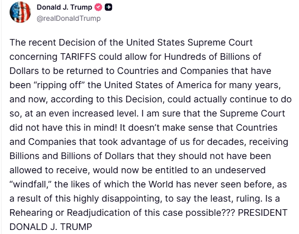 "On yıllarca bizden faydalanan, hak etmedikleri milyarlarca doları alan ülkelerin ve şirketlerin, bu son derece hayal kırıklığı yaratan karar sonucunda, dünyanın daha önce hiç görmediği türden hak edilmemiş bir ‘beklenmedik kazanç’ elde etme hakkına sahip olmaları mantıklı değil" değerlendirmesinde bulundu. Bu nedenle ABD Yüksek Mahkemesi’ni gümrük vergileri ile ilgili kararını gözden geçirmeye çağıran Trump, "Bu davanın yeniden görülmesi veya yeniden karara bağlanması mümkün mü?" diye sordu.
