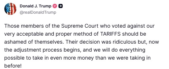 Mahkemenin yaptığı şeyin tarifeleri iptal etmek değil, tarifeleri uygulama yollarından birinin önünü kapatmak olduğunu savunan Trump, kendisine tarife uygulama imkanı sağlayan başka yasalar olduğunu söylemişti. Diğer yasaları ve tarife uygulama yetkilerini kullanabileceğine dikkat çeken Trump, mevcut "ulusal güvenlik" tarifelerinin aynen korunacağını ve bütünüyle yürürlükte kalacağını ifade etmişti. Trump, "Bugün ayrıca, halihazırda uygulanmakta olan tarifelere ek olarak, (Ticaret Yasası) 122. madde uyarınca yüzde 10’luk küresel bir tarife getiren bir kararname imzalayacağım" demişti.