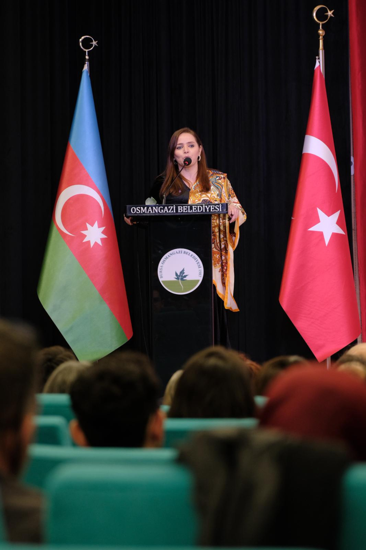 Bursa Azerbaycan İnovasyon ve Dayanışma Dernek (BAİDD) Başkanı Latife Nağdalıyeva yaptığı açış konuşmasında, Hayallerin gerçekleştiği Karabağ Zaferinin 5. Yıl dönümünde Türkiye başta olmak üzere Karabağ’ın azat olmasında verilen mücadeleye destek olan Türk halklarına teşekkür etti.