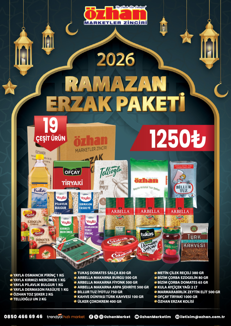 Her gün taze ve hijyenik koşullarda sunulan ürünleriyle dikkat çeken Özhan, et reyonundan unlu mamullere, meyve-sebze reyonundan temel gıda ürünlerine kadar geniş bir yelpazede Ramazan ayında da hizmet vermeye devam edecek. Özhan Market, her yıl olduğu gibi bu yıl da Ramazan’a özel hazırladığı zengin içerikli Ramazan paketleri ile dikkat çekiyor. Kuru bakliyat, kahvaltılık ürünler, temel gıda maddeleri ve içeceklerden oluşan bu paketler, isteğe bağlı olarak kişiye özel içeriklerle de düzenlenebilecek.